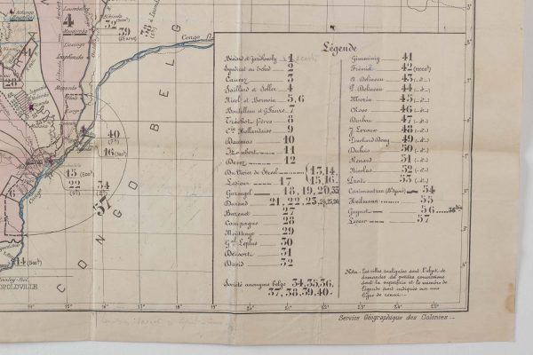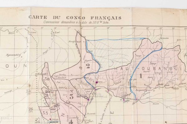 Exceptionnelle carte du Congo français réalisée par le service géographique des colonies faisant état des concessions demandées à la date du 18 octobre 1898.