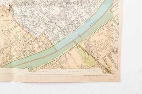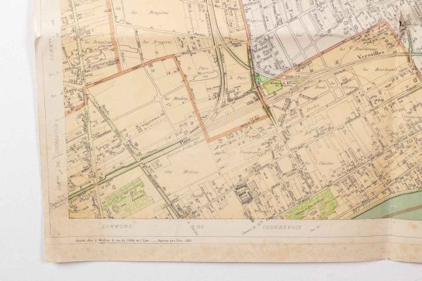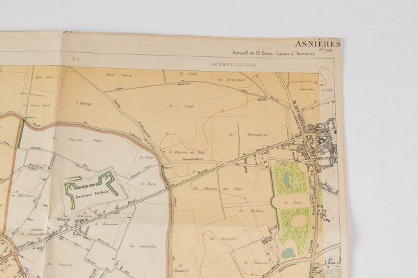 - Département de la Seine, Commune de Gennevilliers, Asnière et Bois Colombe, dressée par le service des ponts et chaussées du département, gravée chez L. Wuhrer, 1900. Pliures, petites déchirures et légères rousseurs. Dimensions : 90 x 65 cm.