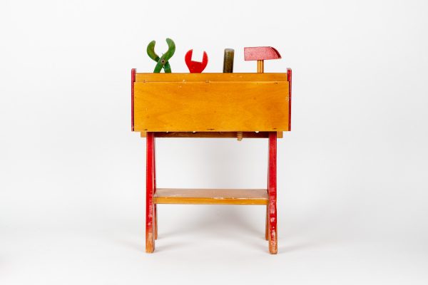 Etabli vintage en bois pour enfant comprenant : un marteau, un tournevis, une clé anglaise, une pince, 6 vis, 4 « clous », 3 plaques percées.