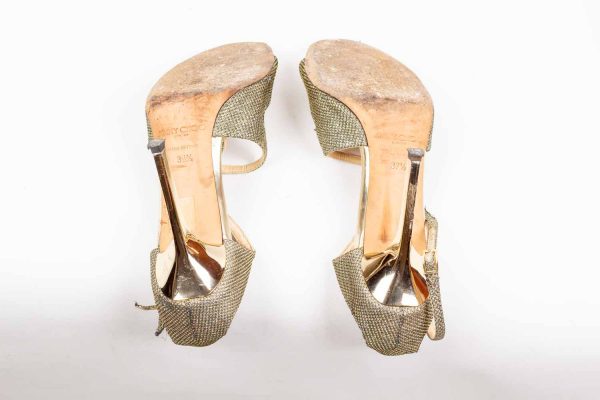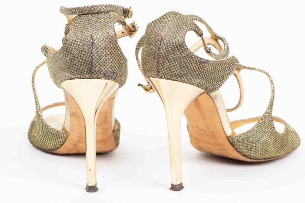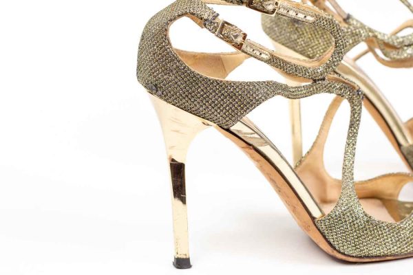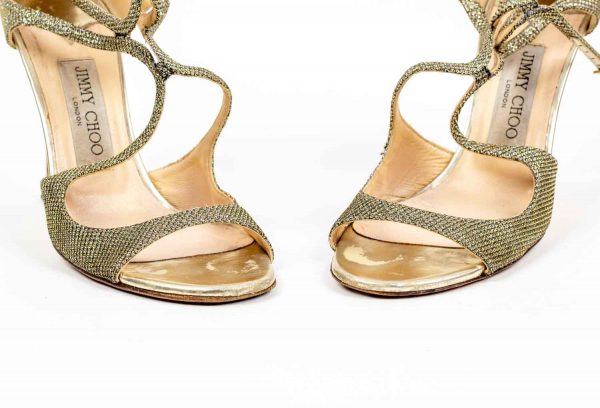 JIMMY CHOO, paire de sandales modèle Lance, dorée à lanières entrelacées, Hauts talons fins et double bride ajustables.