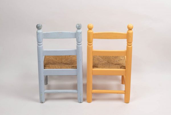 VenduPaire de chaises vintage paillées en bois mouluré pour enfants, anciennement repeintes.