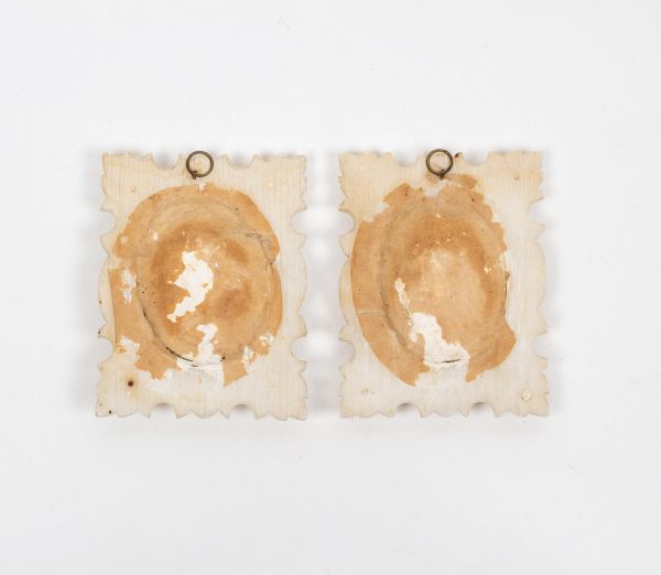 Paire de miniatures à vue ovale en albâtre, sculptées en haut relief. le premier représentant le Christ, le second représentant Sainte Anne et la Vierge. Les sujets protégés par un verre bombé tenu par un cerclage en laiton torsadé.