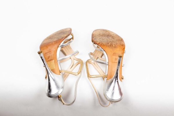 PRADA, paire de sandales nus pieds à lanières argentées et dorées.